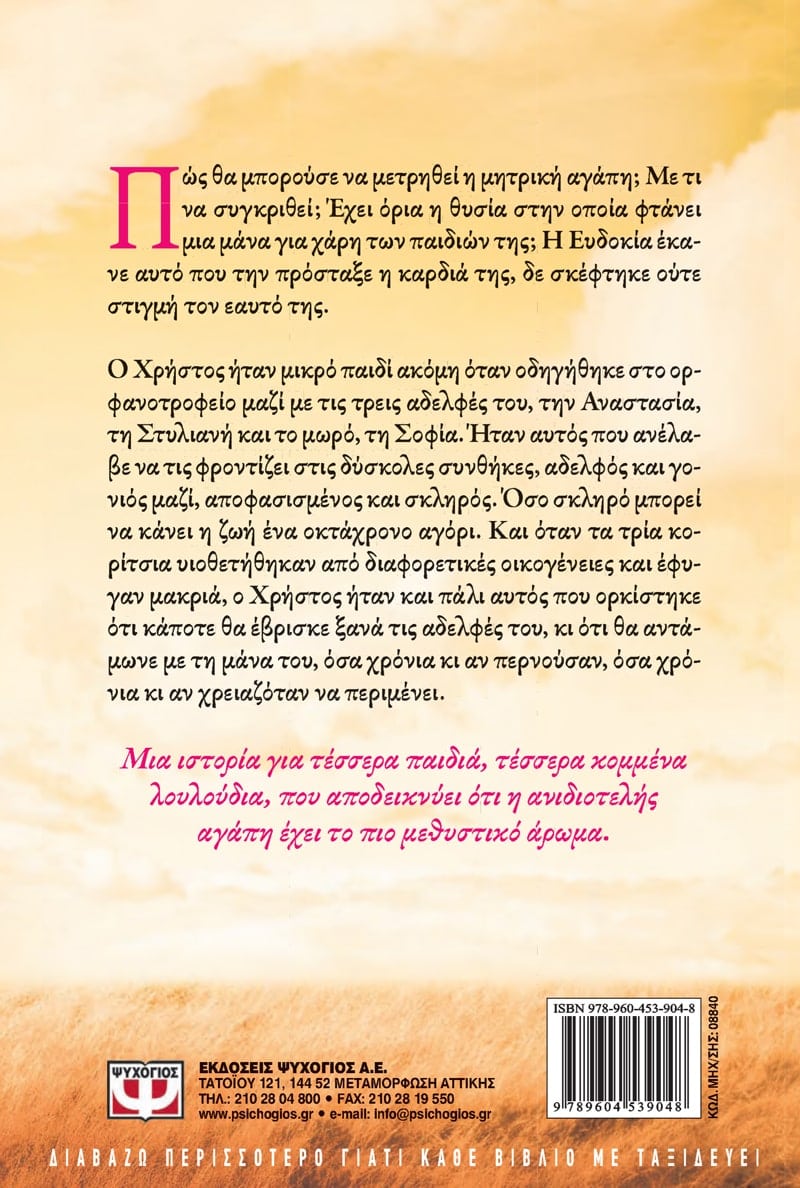 Christos was only a small child when he was taken to the orphanage along with his three sisters, Anastasia, Styliani and baby Sophia. It was he who took their care into his little hands, taking on the roles of brother and parent together. And life made him determined and hard, as hard as life can turn an eight-year old boy. When all three sisters were adopted by different families and sent far away, again Christos was called upon to swear that one day the siblings would be brought back together, that he would find them and unite them with their mother, however many years would pass, however long they would have to wait… A moving novel of four children, of four cut flowers, that is proof of the eternal strength of pure and selfless love.